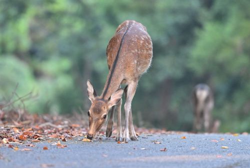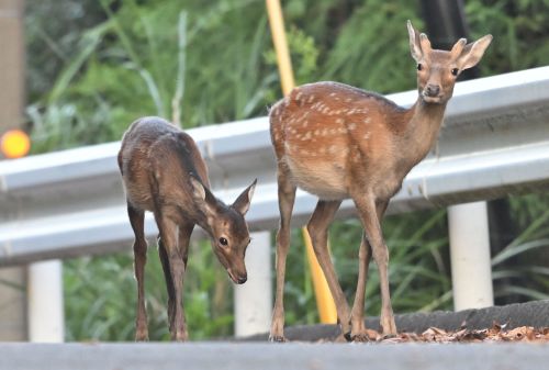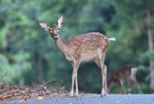 母鹿の呼びかけに応じ、林の中へ消える。 |