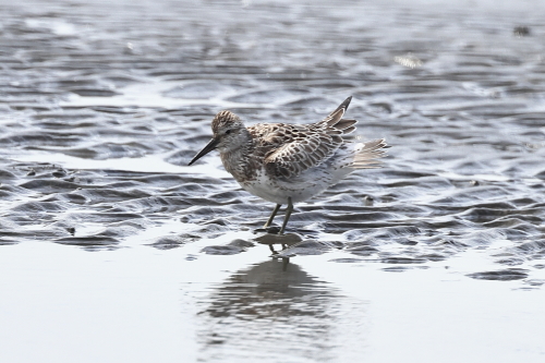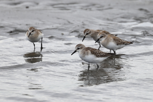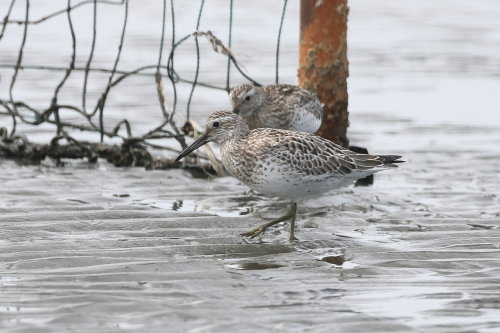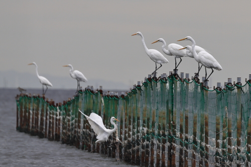囲いの鉄杭の上で並ぶダイサギたち。 |