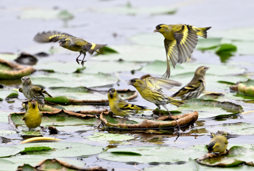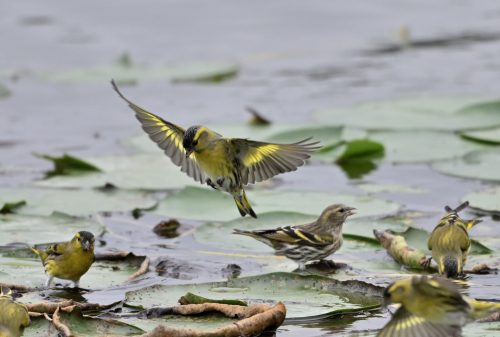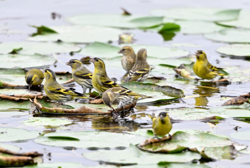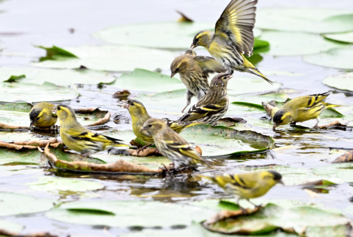 | マヒワたちは、この日も水飲みに。 水面の葉っぱに乗って、水を飲むと一瞬で飛び去る。 |