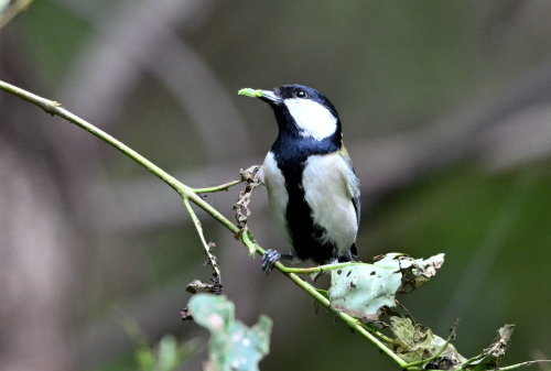 | 森の中では。 青虫を捕獲したシジュウカラ。 |