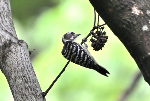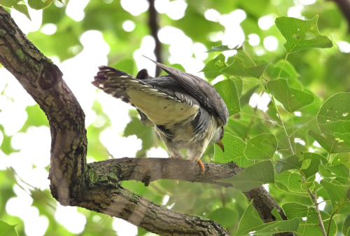 | 態勢の入れ替え。 尾羽の下は、わずかだが白い黒斑がある。 尾羽の下に横縞があるホトトギスも居るという。 鳴かないと分からない。 |