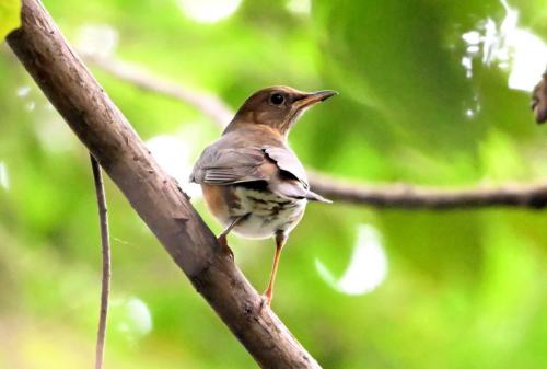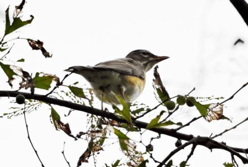 一瞬、枝にとまったアカハラ。