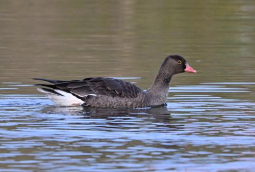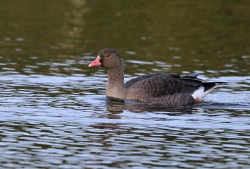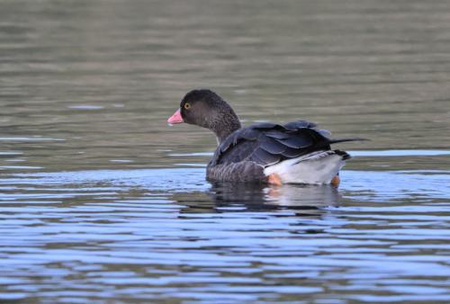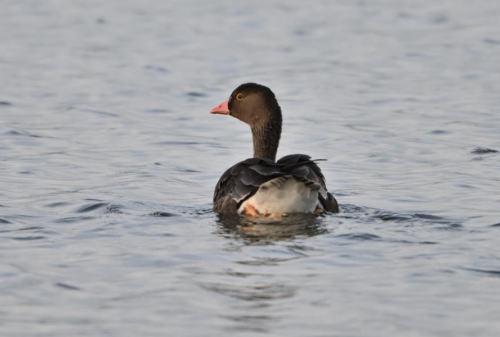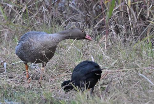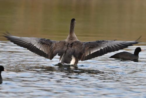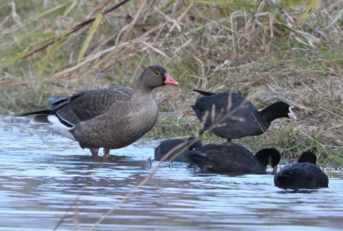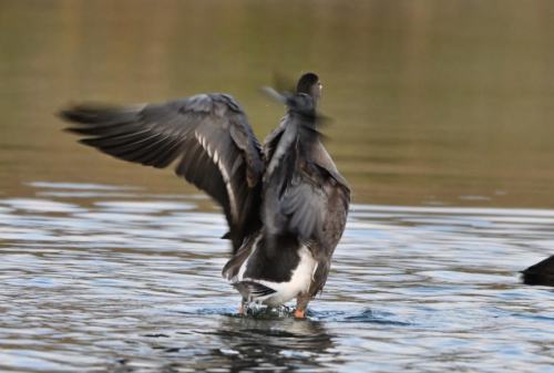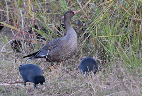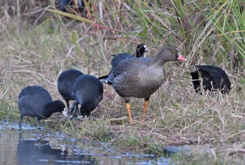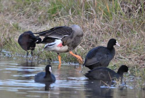 夜明けに到着すると、オオバンと共に岸辺で採餌中。 |
