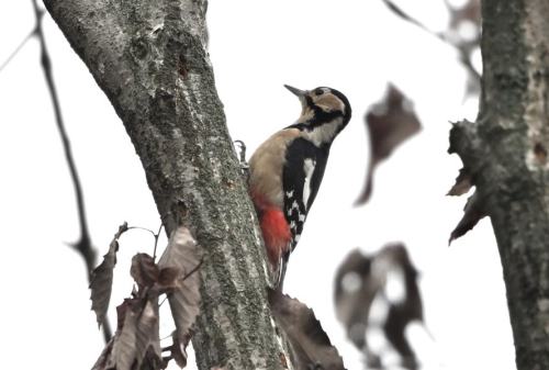 アカゲラが枯れ木を上る。
