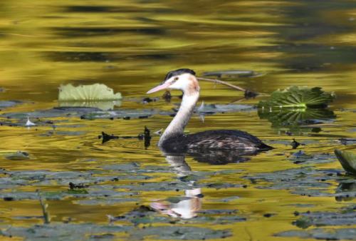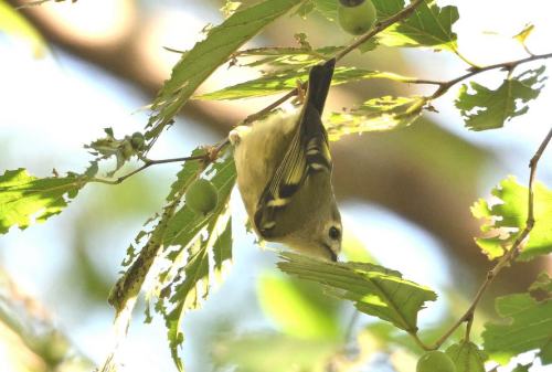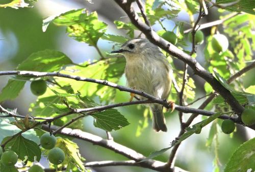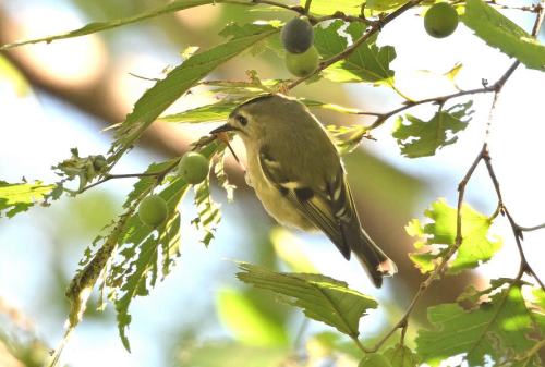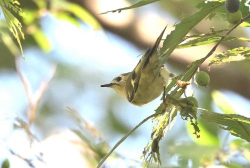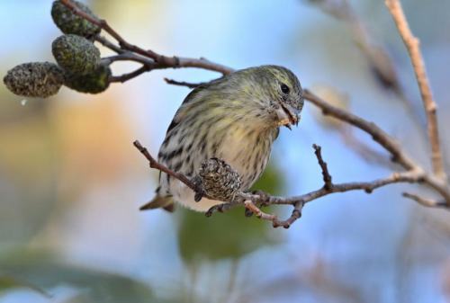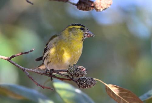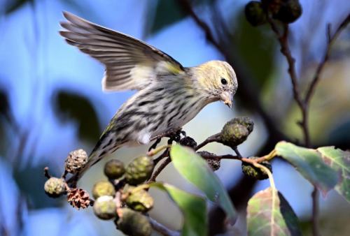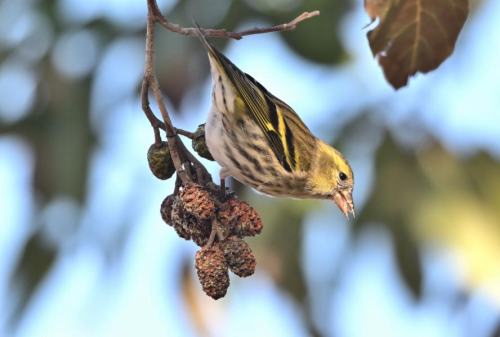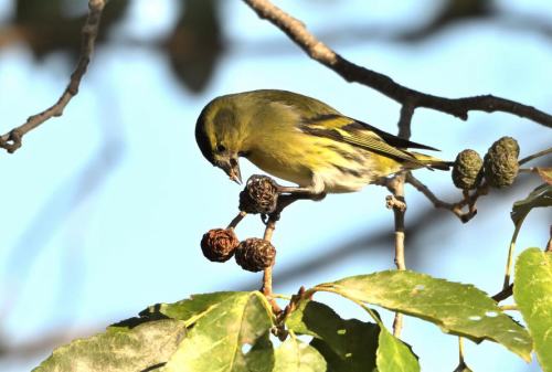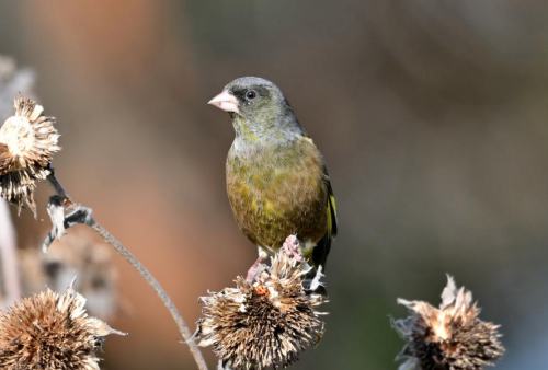 朝早くヒマワリの種を求めてやって来るカワラヒワ。