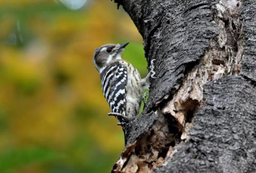 枯れ木を上るコゲラ。