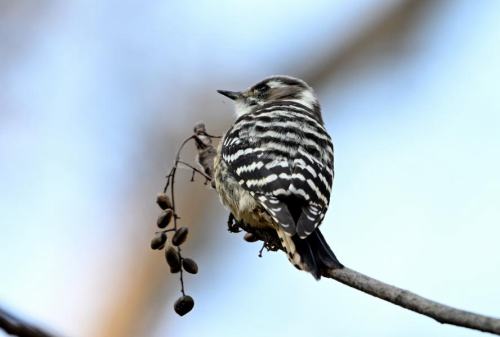 ハゼの実を採るコゲラ。