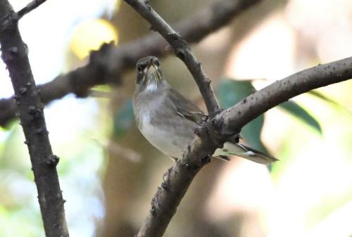 暗い林の木にシロハラ。