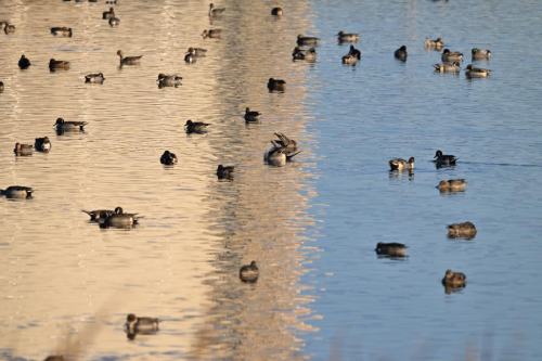 岸辺近くでは、オナガガモが休息中。