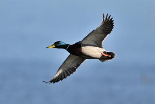 飛翔するマガモ。