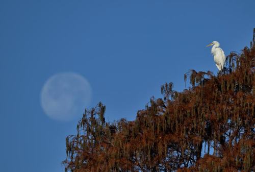 月を眺めるダイサギ。