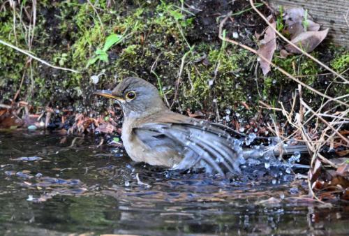 水路で水を飲むシロハラ。