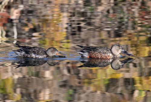 2羽のハシビロガモが遊泳。