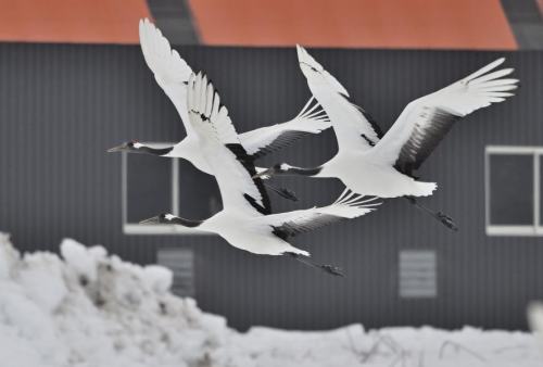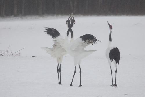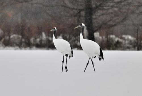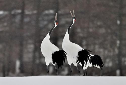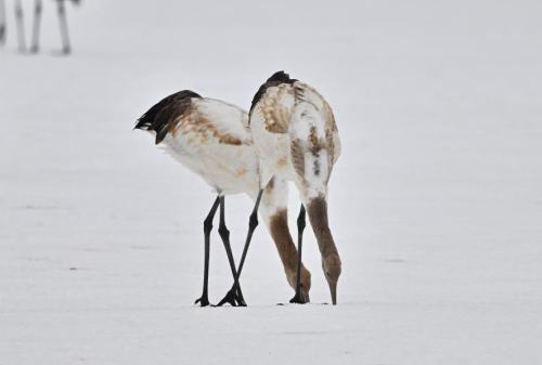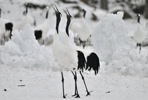 | タンチョウ幼鳥が鳴き交わす。 | |