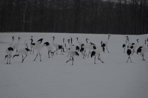 | 12月21日から23日まで、釧路を拠点に道東を探鳥。 初日は小雨模様なので、鶴居村のタンチョウを撮影。 9年振りの訪問。 前日までの寒波は収まり、比較的暖かい。 しかし、暗く、傘をさしての撮影。 鶴居村の鶴見台にて (12月21日撮影) 餌場に集まるタンチョウ。 雨が強くなると、動きは少なくなり、停止状態になる。 |