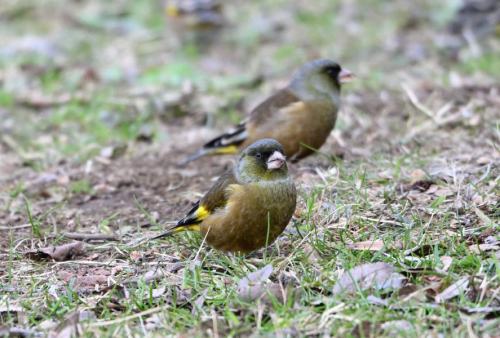 地上で採餌中のカワラヒワ。