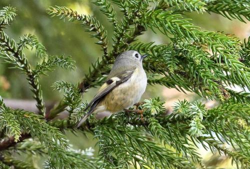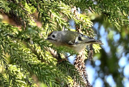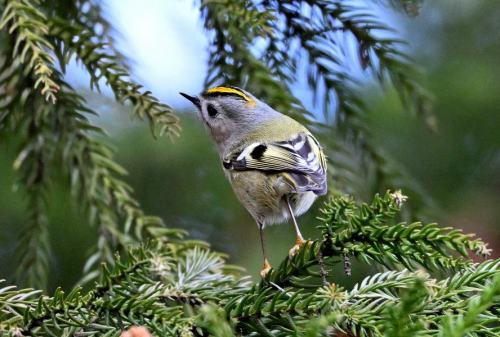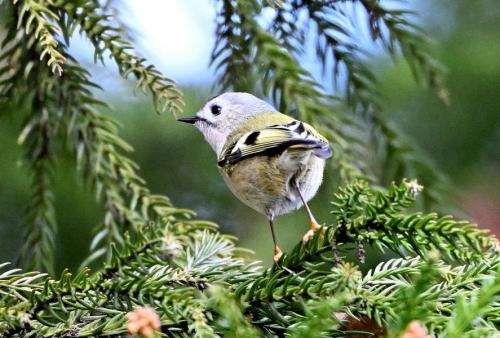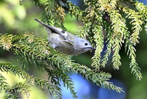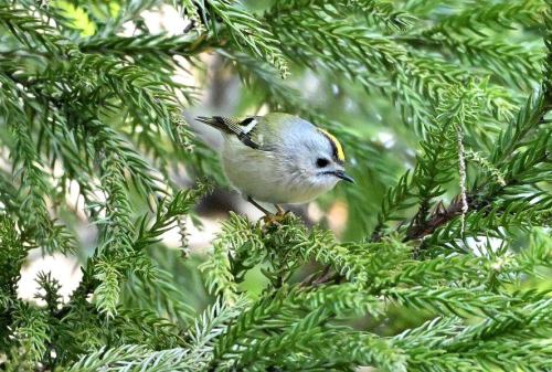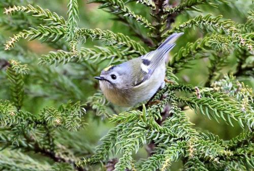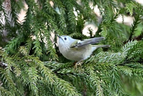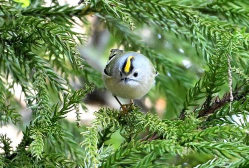 2~3羽のキクイタダキが、「さわら」に付いた虫を探す。