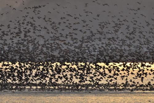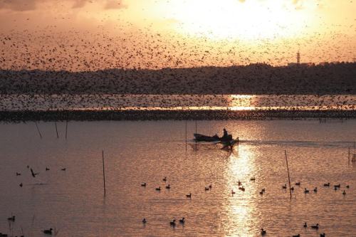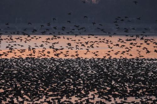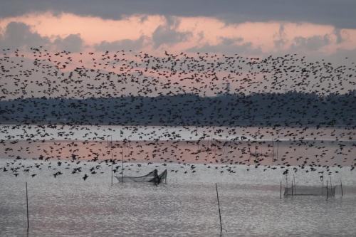 夜明け前、水面から次々と飛び出して行く。