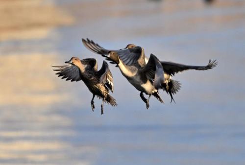 着水態勢のオナガガモのペア。