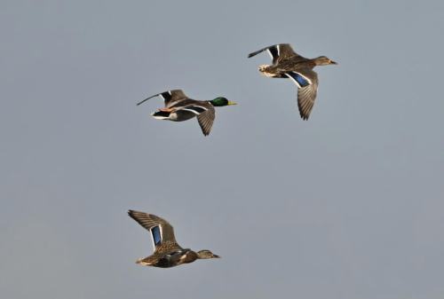 飛翔するマガモ。