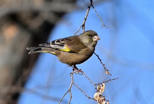 アキニレの実を啄むカワラヒワ。