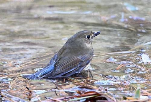 水場で水浴び中のルリビタキ。 |
