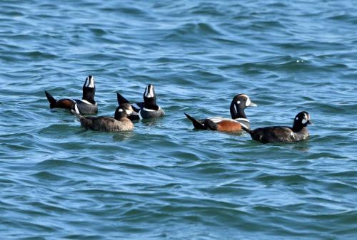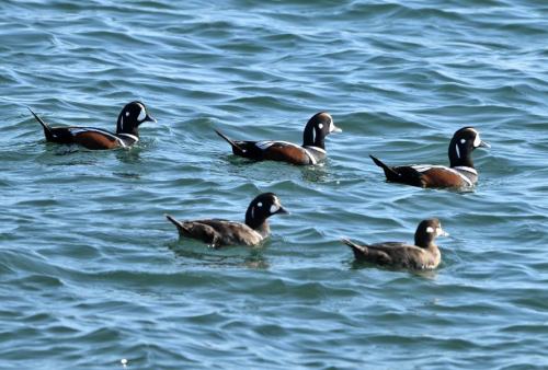 | 北上。 片貝漁港の最先端から探索。 遠くにシノリガモの小さな群れ。 |