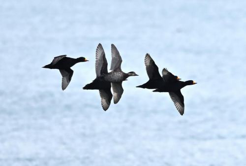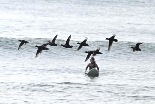 | 更に北上して、旭市の埠頭で探索。 完全な逆光。 サーフアーの近くを飛ぶクロガモ。 |