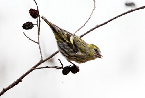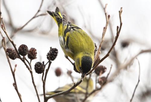 10羽ほどのマヒワがハンノキで食事中。