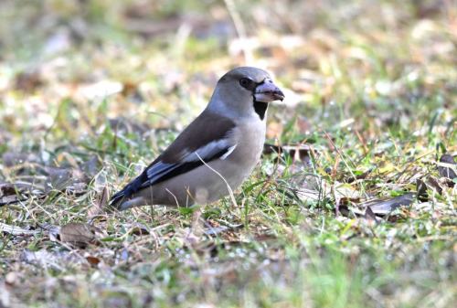 地上で採餌中のシメ。