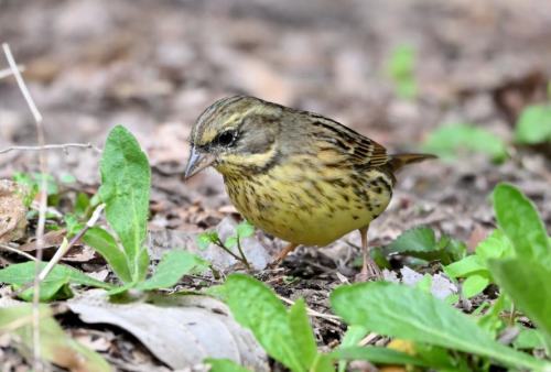 地上で採餌するアオジ。